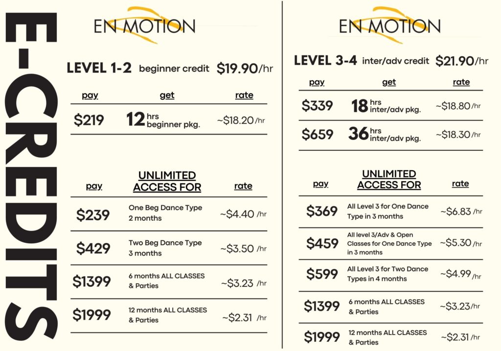 All En Motion classes price system are standardise as follow